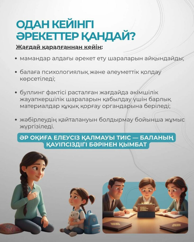 ⤴️ Жоғарыда берілген инфографикада — әрекет ету алгоритмі, құқықтық шаралар және ата-аналарға, педагогтер мен мамандарға арналған нақты ұсынымдар ұсынылған.